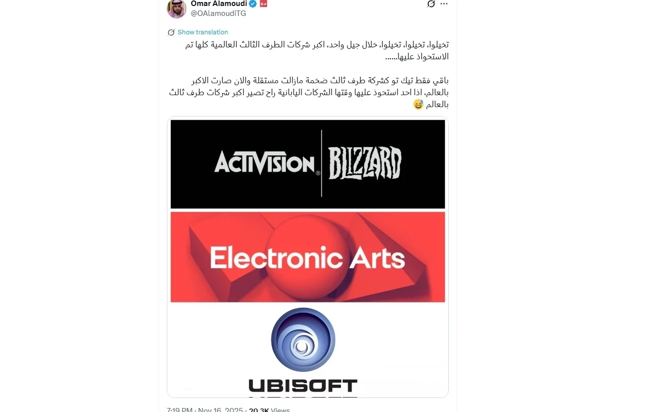 Масла в огонь подлил пост инсайдера и журналиста TrueGaming Омара Аламуди. В своих соцсетях он написал о «покупке крупнейших игровых компаний за одно поколение» и опубликовал картинку с логотипами Activision Blizzard (куплена Microsoft), Electronic Arts (сделка с PIF, Silver Lake и Affinity Partners) и… Ubisoft. Правда, позднее Аламуди намекнул на то, что его пост — это просто личные рассуждения.