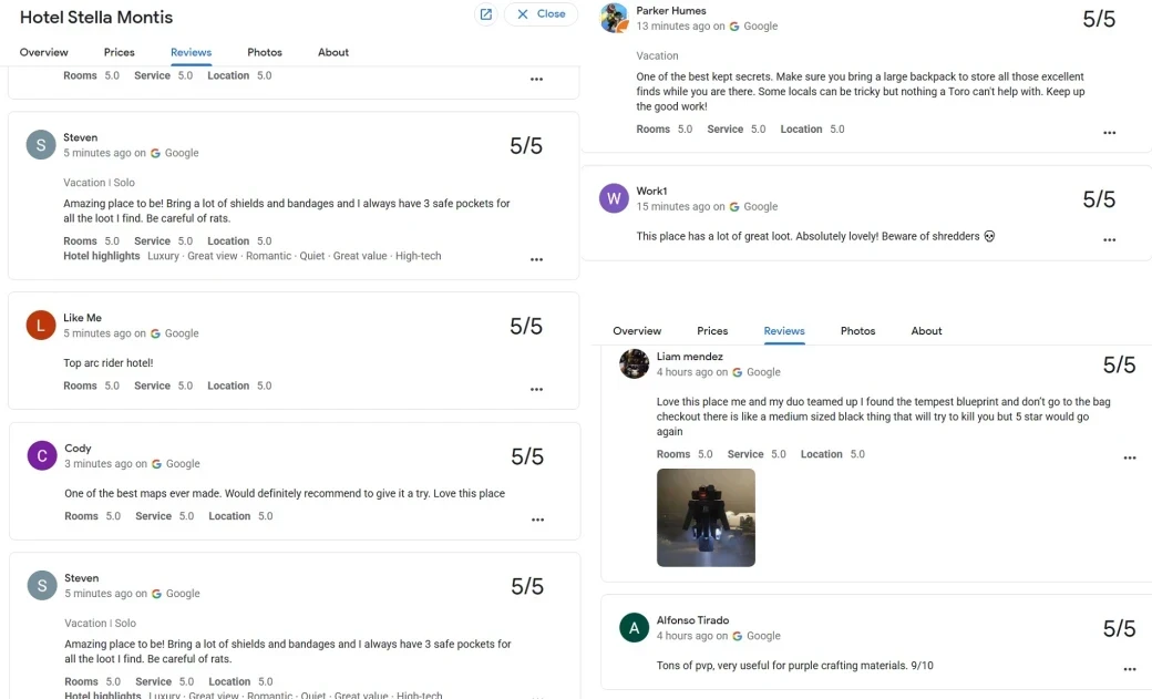 Первые шуточные отзывы появились около месяца назад, но геймеры не думают останавливаться. К счастью, им в целом «всё нравится», поэтому рейтинг отеля не пострадал. Однако встречаются и плохие отзывы, тоже оставленные игроками ARC Raiders.