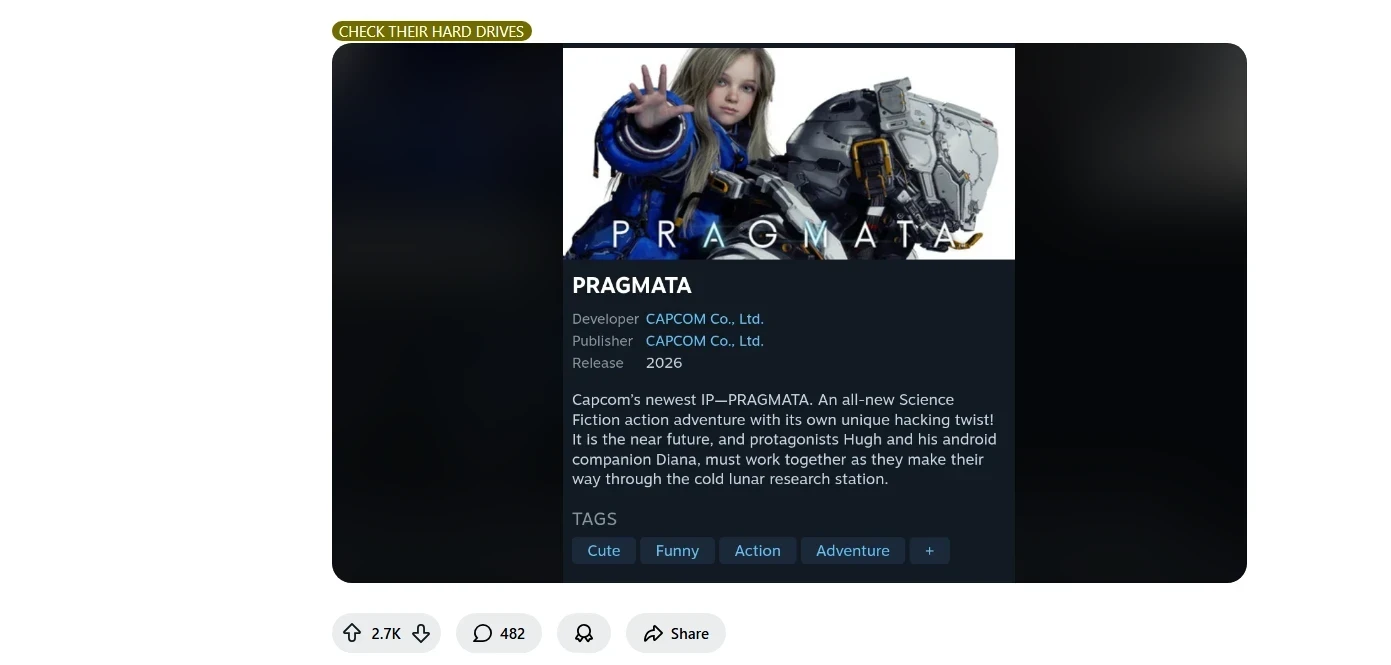 Кстати, несколько месяцев назад страницу Pragmata в Steam пометили комбинацией тегов, которую называют «свистком» для тех, «о ком не говорят в приличном обществе». Вот такой вот ещё один день в интернете.