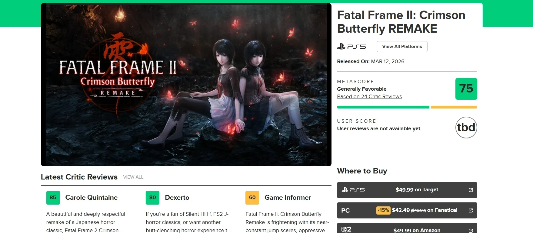 Японский хоррор Fatal Frame 2: Crimson Butterfly Remake получил тёплый приём критиков