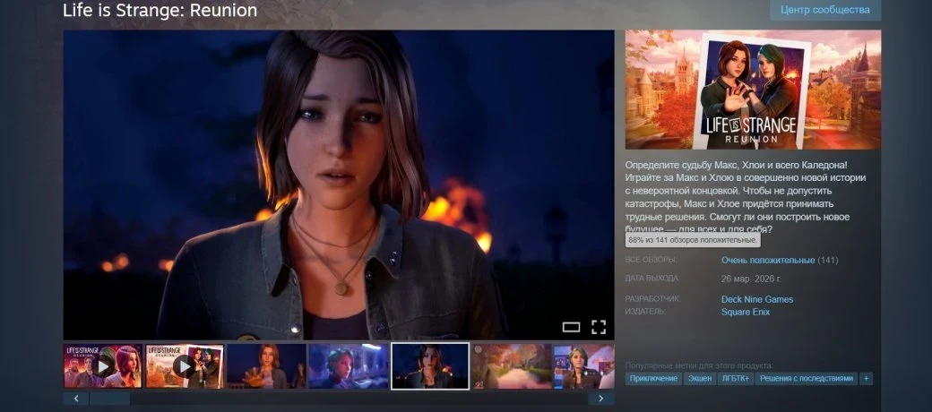 В Steam у Life is Strange: Reunion «очень положительный» рейтинг на основе 141 обзора и 88% одобрения. А пиковый онлайн достиг 8 111 игроков одновременно — в рамках франшизы это чуть выше показателя Life is Strange: True Colors (8 001) и чуть меньше Life is Strange: Double Exposure (8 524).