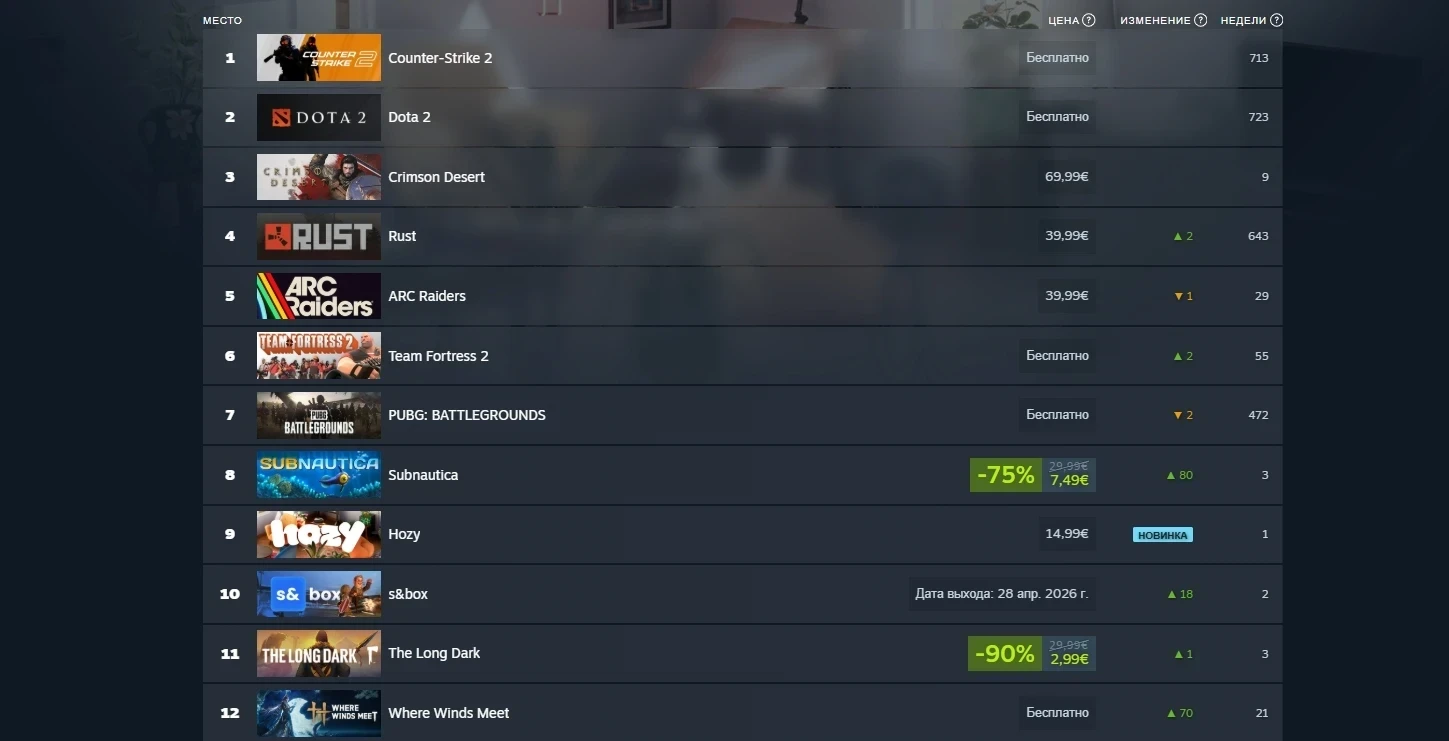 Российский чарт Steam также практически не изменился. Но сразу на 80 строчек, оказавшись на 8 месте, поднялась Subnautica. А ещё игроки активно предзаказывают песочницу s&box и покупают песочницу Hozy.