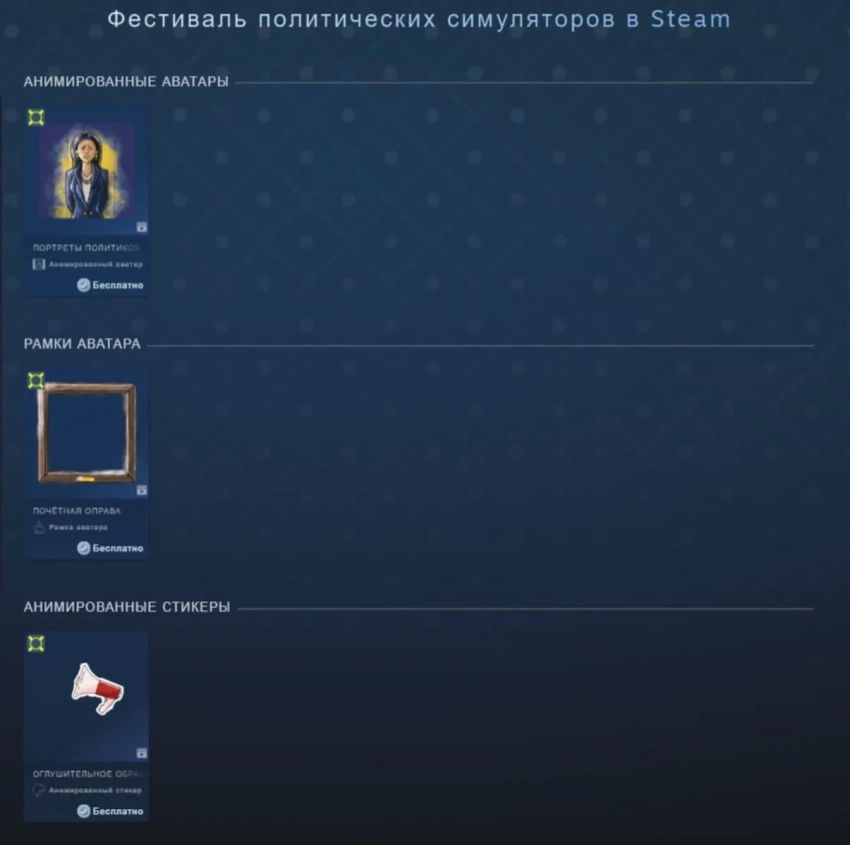 Пользователи Steam также могут получить эксклюзивные украшения для профиля: аватар «Портреты политиков», анимированную рамку «Почётная оправа» и стикер «Оглушительное обращение». Все предметы доступны бесплатно на время фестиваля.